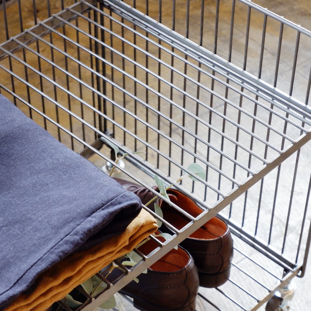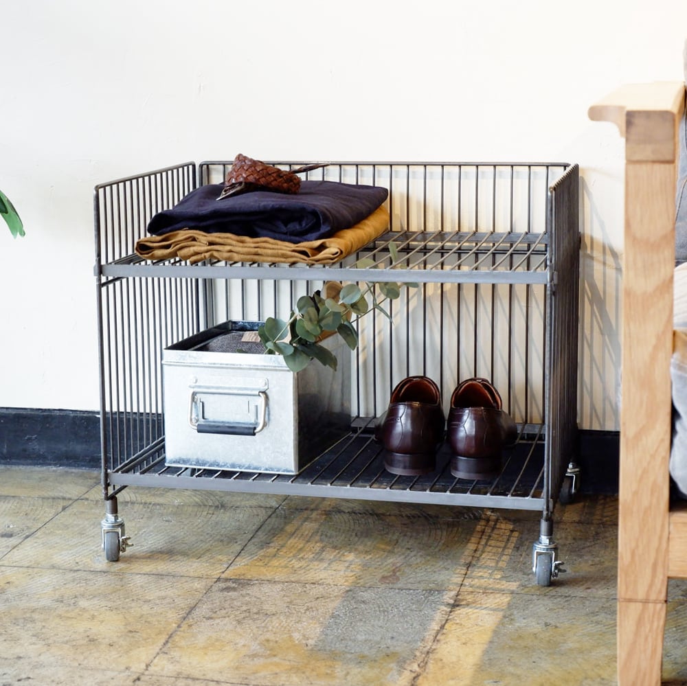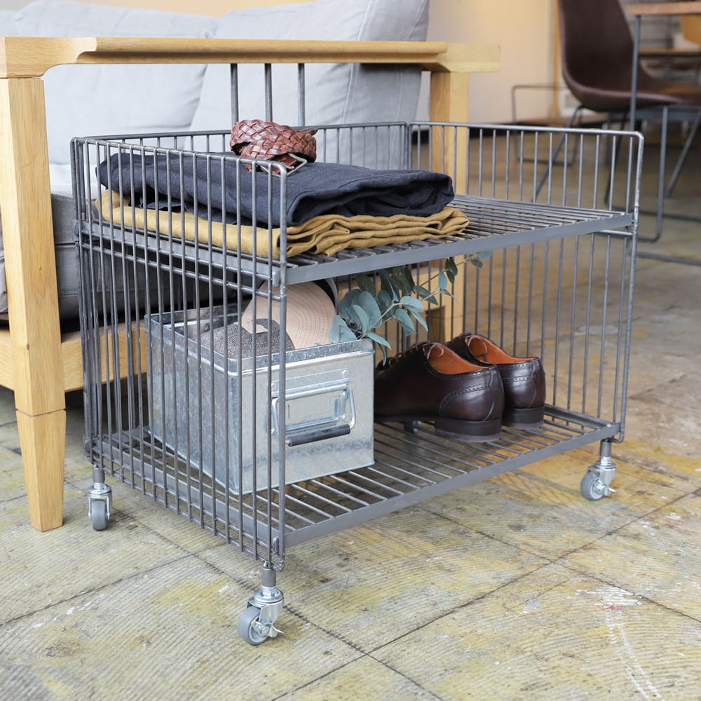 鉄ならではの重厚感や無機質でインダストリアルな雰囲気が魅力のワイヤーワゴン。