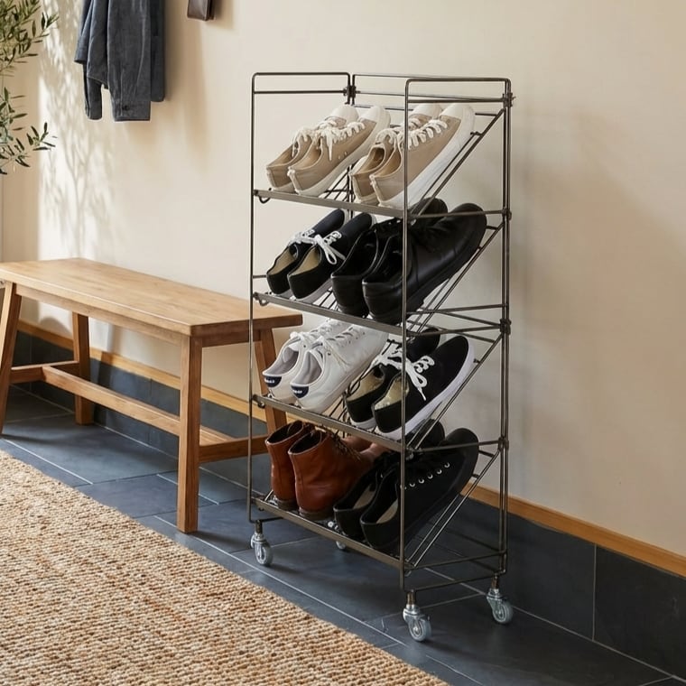 ワイヤーシューズラック COLLEND コレンド 靴収納 スチールラック 無骨デザイン インダストリアル かっこいい おしゃれ収納 玄関 靴棚 ディスプレイ 通気性 スリム 省スペース 4段 8足収納 サンダル スニーカー なめらかキャスター ストッパー付き 組立簡単 樹脂パーツ付属 幅60cm