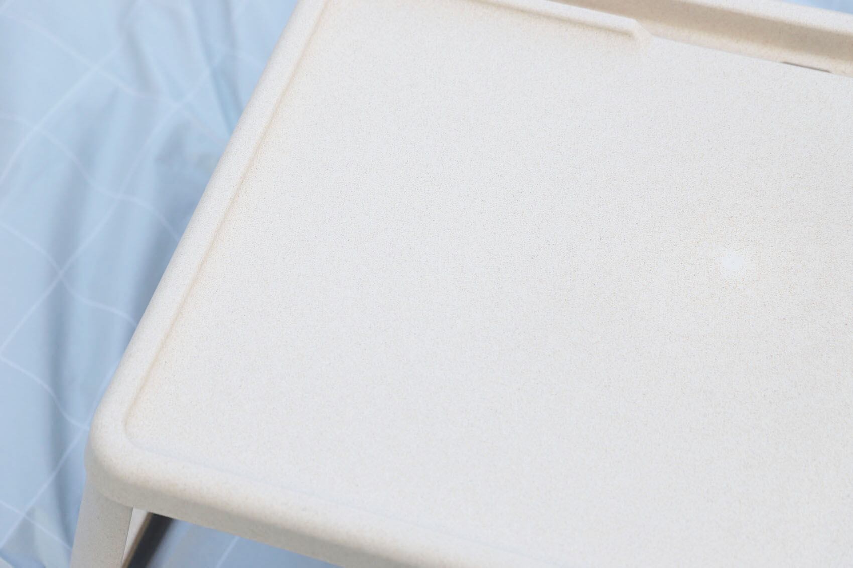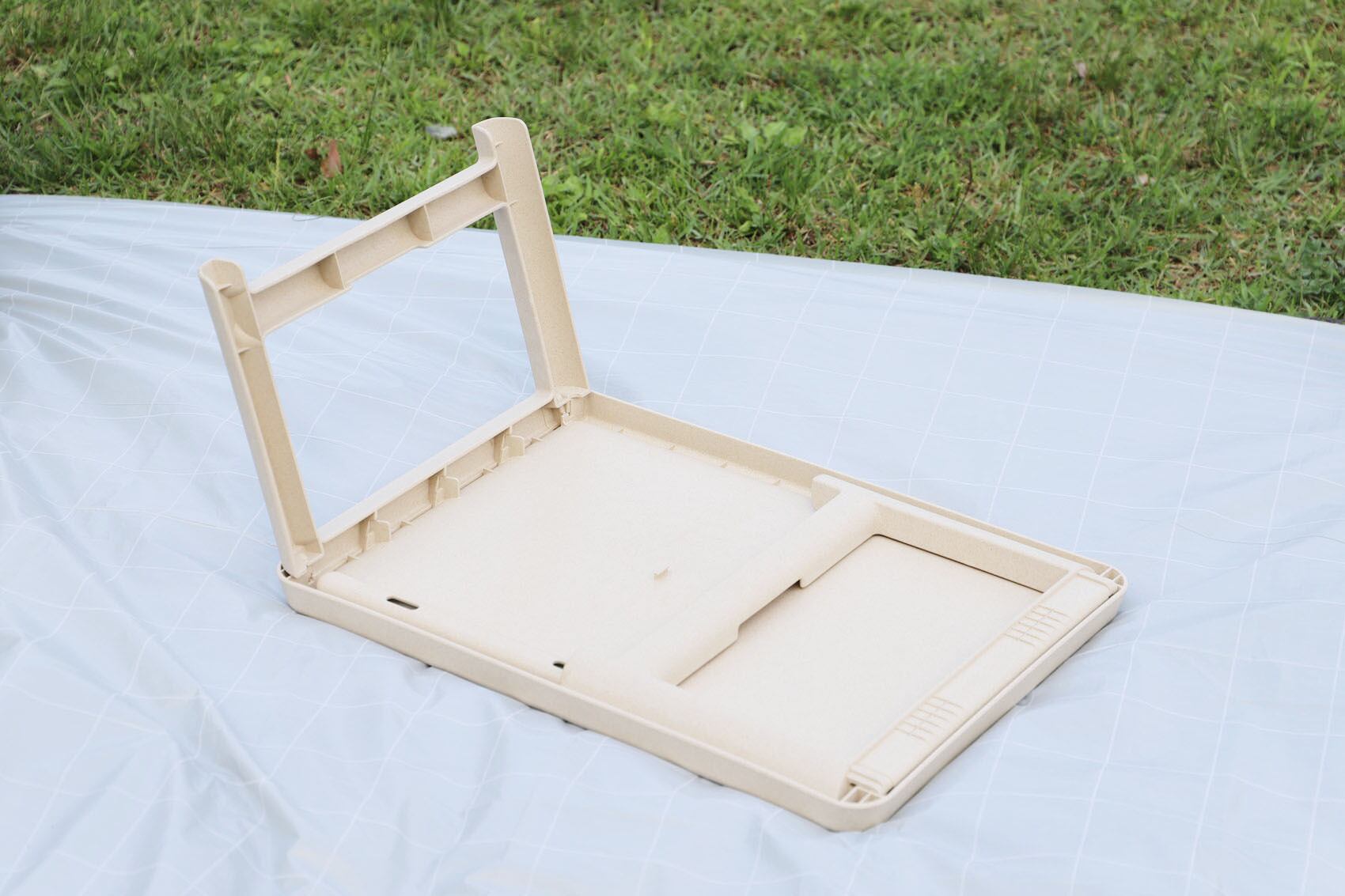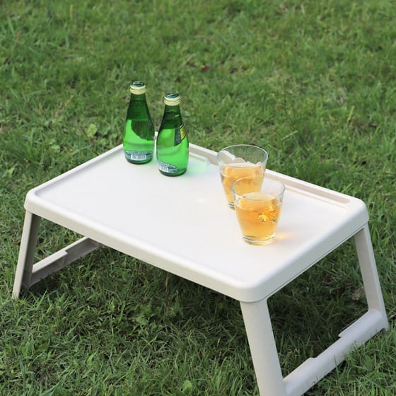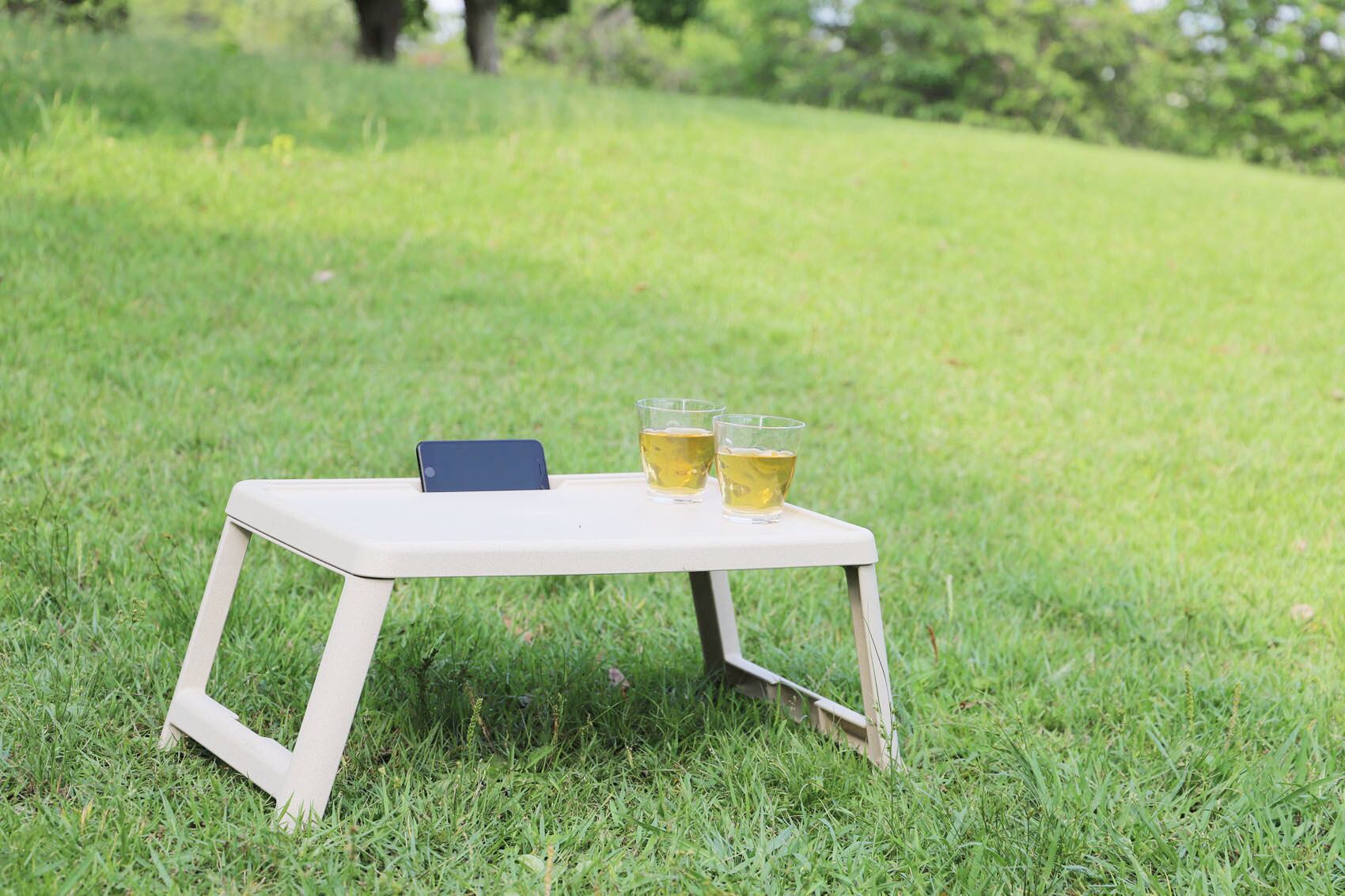 樹脂製で軽く、ピクニックやアウトドアはもちろん、テレワークやオンライン授業にも大活躍。スマートフォンやタブレットがスタンドできる溝とケーブル穴付き。