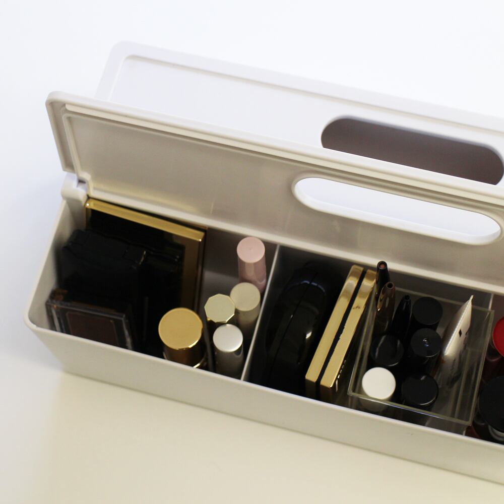 片側仕切り付きで、文具やコスメなど細かい物の仕分けも簡単。